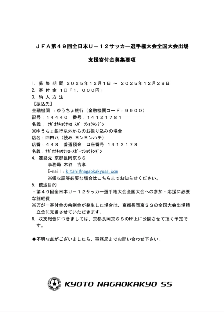 KYOTO NAGAOKAKYO SS【全国大会出場に伴う寄付金募集の...】ページ